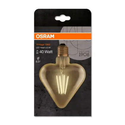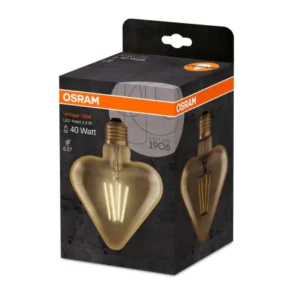 Cette ampoule Osram Vintage 1906 LED E27 Heart Filament Dorée 4.5W 470lm - 825 | Remplacement 40W avec son efficacité lumineuse de lumen par watt vous permettra de profiter d’un éclairage de qualité. Avec sa durée de vie de 15000 heures, vous n’aurez pas à vous soucier de son remplacement avant quelques années.