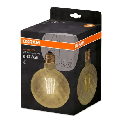 Cette ampoule Osram Vintage 1906 LED E27 Pine Filament Dorée 4.5W 470lm - 825 | Remplacement 40W avec son efficacité lumineuse de lumen par watt vous permettra de profiter d’un éclairage de qualité. Avec sa durée de vie de 15000 heures, vous n’aurez pas à vous soucier de son remplacement avant quelques années.